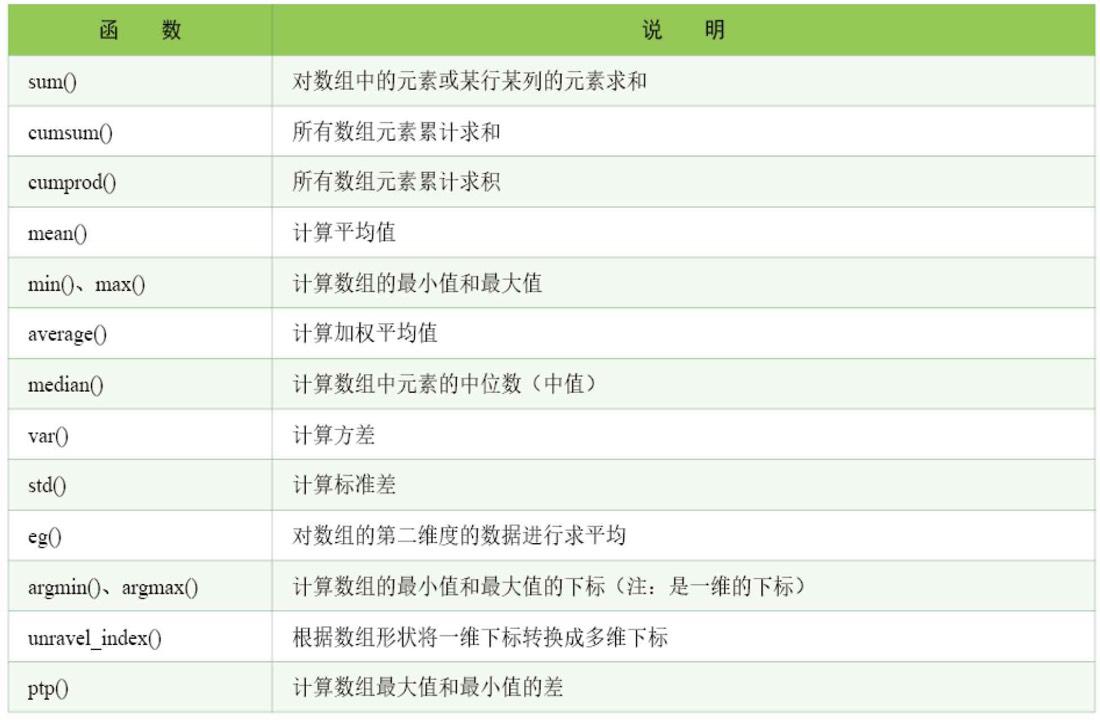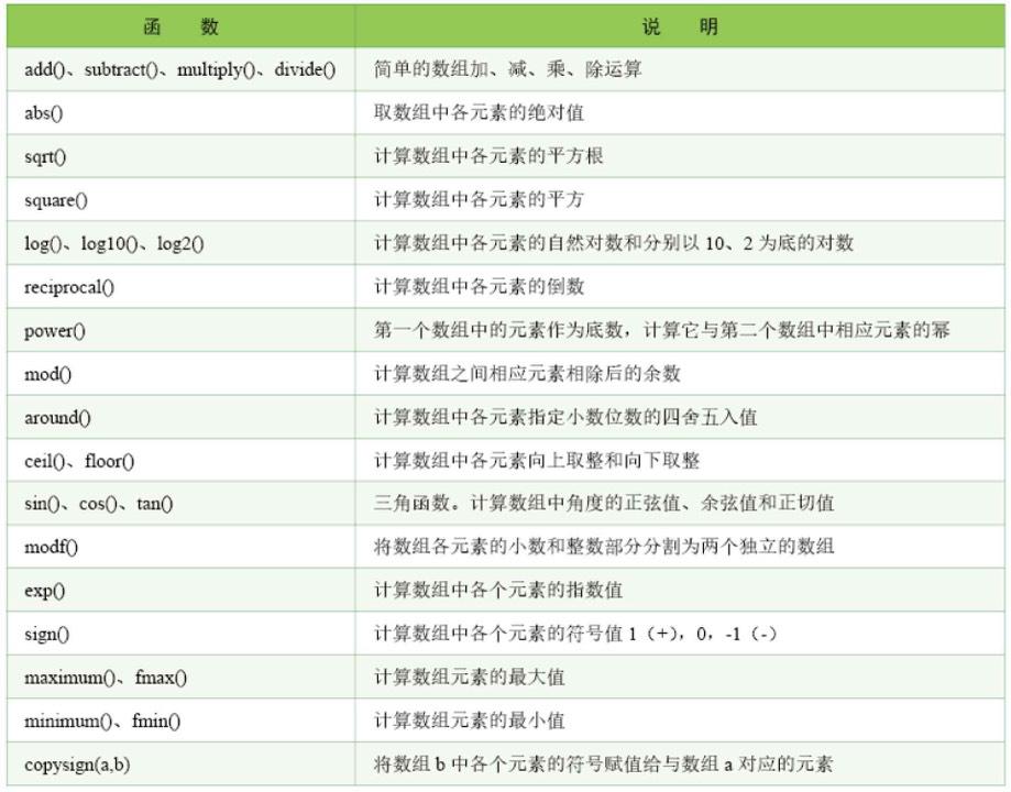 NumPy中包含大量的各种数学运算的函数,包括三角函数、算术运算函数、复数处理函数等,如表所示。
