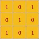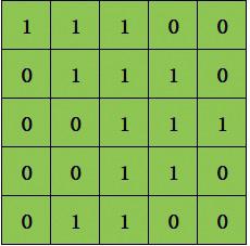 在NumPy中,矩阵应用十分广泛。例如,每个图像可以被看作为像素值矩阵。假设一个像素值仅为0和1,那么5×5大小的图像就是一个5×5的矩阵,如图6.25所示,而3×3大小的图像就是一个3×3的矩阵,如图6.26所示。