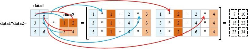 上述举例,是两个矩阵直接相乘,称之为矩阵相乘。矩阵相乘是第一个矩阵中与该元素行号相同的元素与第二个矩阵与该元素列号相同的元素,两两相乘后再求和,运算过程如图所示。例如,1×1+2×3=7,是第一个矩阵第1行元素与第二个矩阵第1列元素经过两两相乘求和得到的。