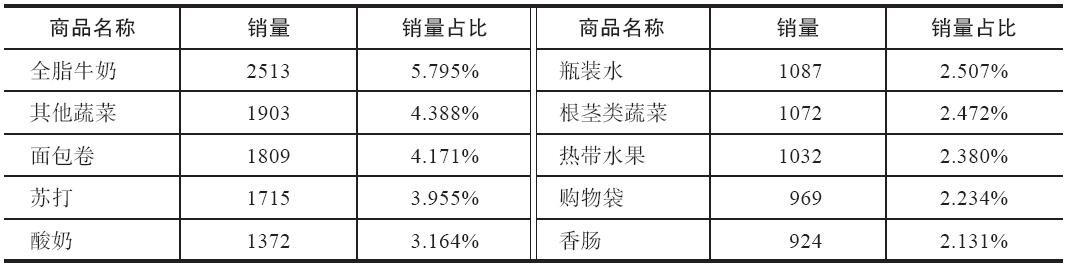 根据代码清单可得销量排行前10的商品销量及其占比情况,如表所示。