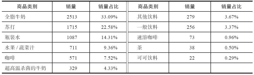 根据代码清单8-4可得非酒精饮料内部商品的销量及其占比情况,如表所示。