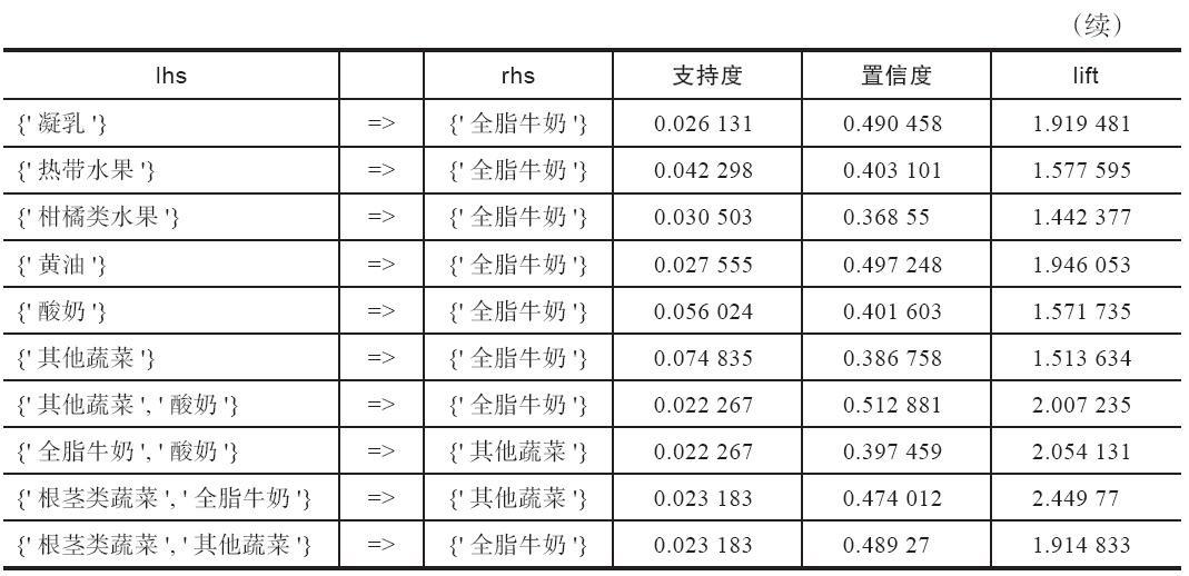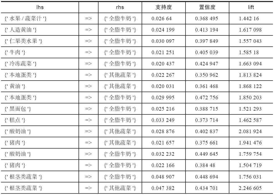 表 购物篮关联规则模型结果
