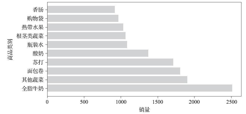 商品热销情况分析是商品管理中不可或缺的一部分,热销情况分析可以助力商品优选。计算销量排行前10的商品销量及占比,并绘制条形图显示销量前10的商品销量情况,如代码清单8-2所示。