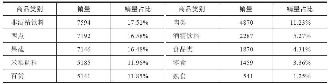 表 各类别商品的销量及其占比