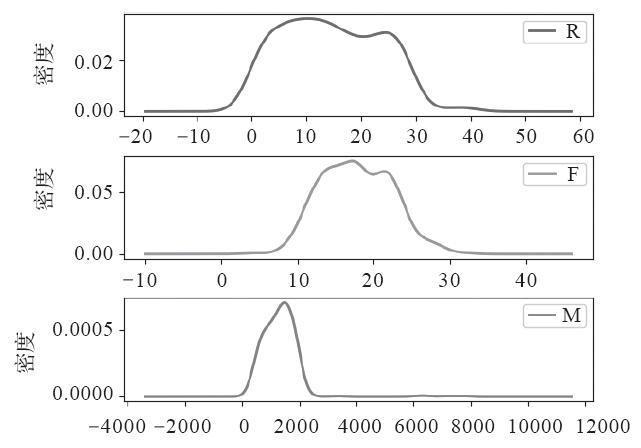 def density_plot(data): # 自定义作图函数 import matplotlib.pyplot as plt plt.rcParams['font.sans-serif'] = ['SimHei'] # 用来正常显示中文标签 plt.rcParams['axes.unicode_minus'] = False # 用来正常显示负号 p = data.plot(kind='kde', linewidth=2, subplots=True, sharex=False) [p[i].set_ylabel('密度') for i in range(k)] plt.legend() return plt pic_output = '../tmp/pd' # 概率密度图文件名前缀 for i in range(k): density_plot(data[r['聚类类别']==i]).savefig('%s%s.png' %(pic_output, i)) |