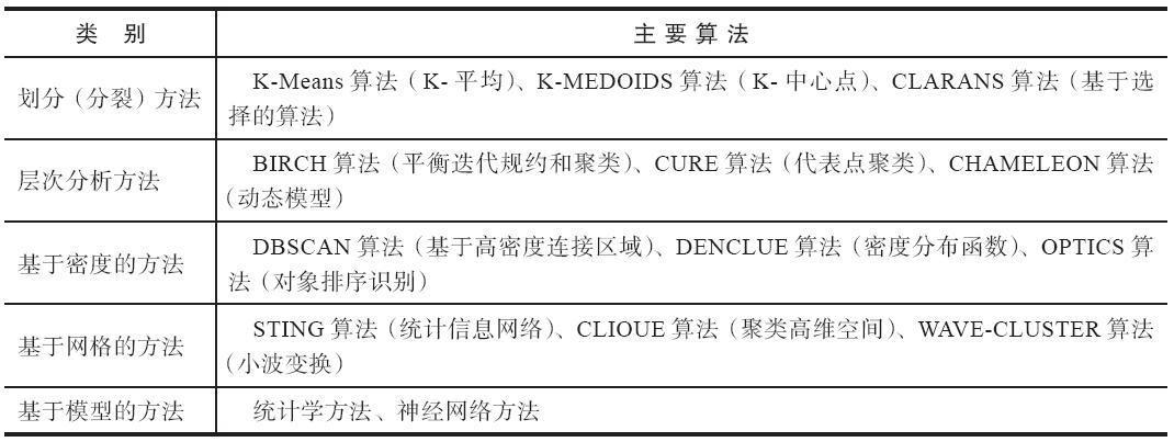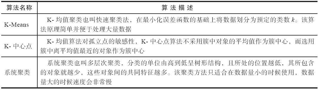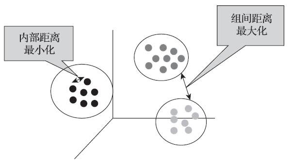 与分类不同,聚类分析是在没有给定划分类别的情况下,根据数据相似度进行样本分组的一种方法。与分类模型需要使用有类标记样本构成的训练数据不同,聚类模型可以建立在无类标记的数据上,是一种非监督的学习算法。聚类的输入是一组未被标记的样本,聚类根据数据自身的距离或相似度将它们划分为若干组,划分的原则是组内样本最小化而组间(外部)距离最大化,如图1所示。