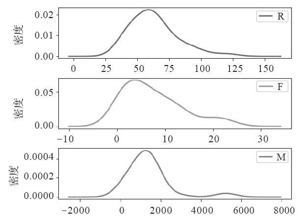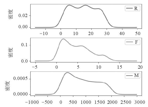 接着用pandas和Matplotlib绘制不同客户分群的概率密度函数图,通过这些图能直观地比较不同客户群的价值,如代码清单5-5所示,得到的结果如图2、图3、图4所示。