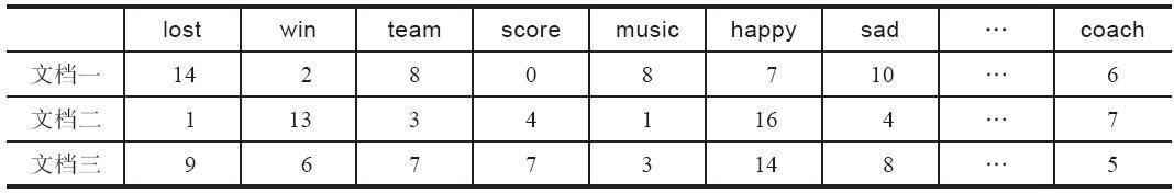 度量文档数据时可使用余弦相似性。先将文档数据整理成文档—词矩阵格式,如表3所示。