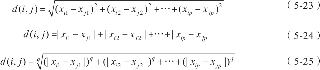 式(5-25)中,q为正整数,q=1时即为曼哈顿距离;q=2时即为欧几里得距离。