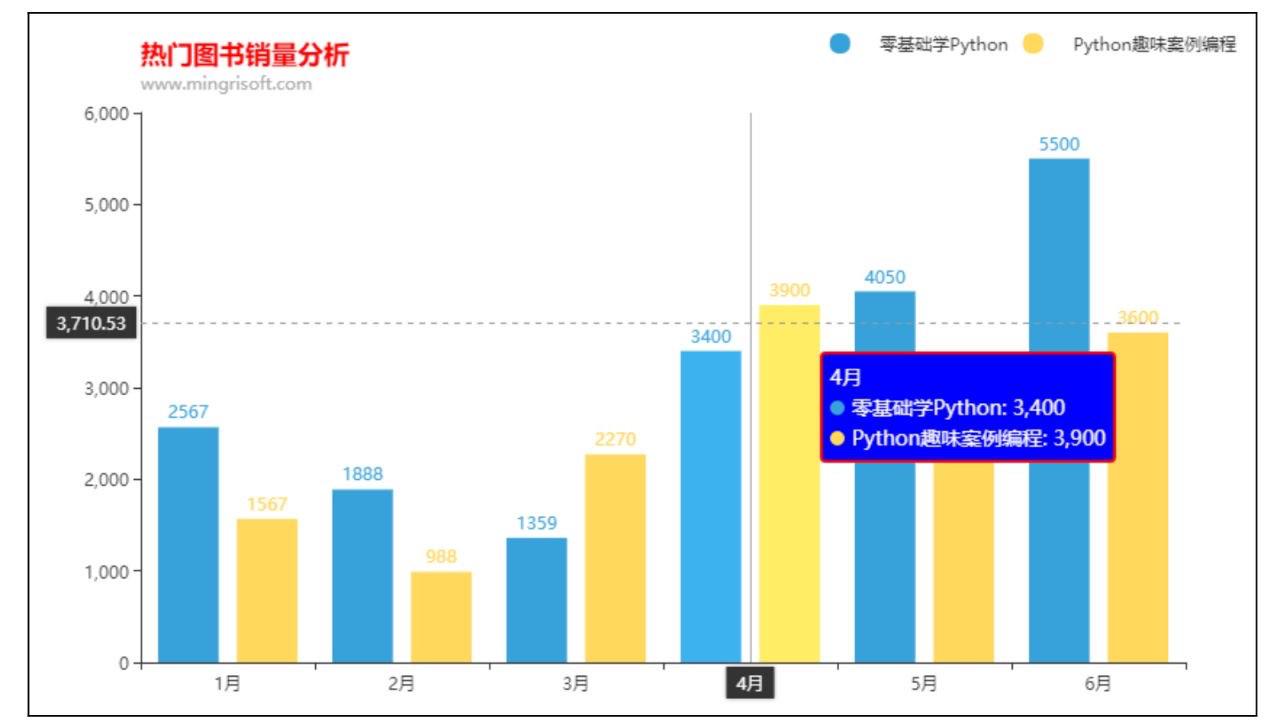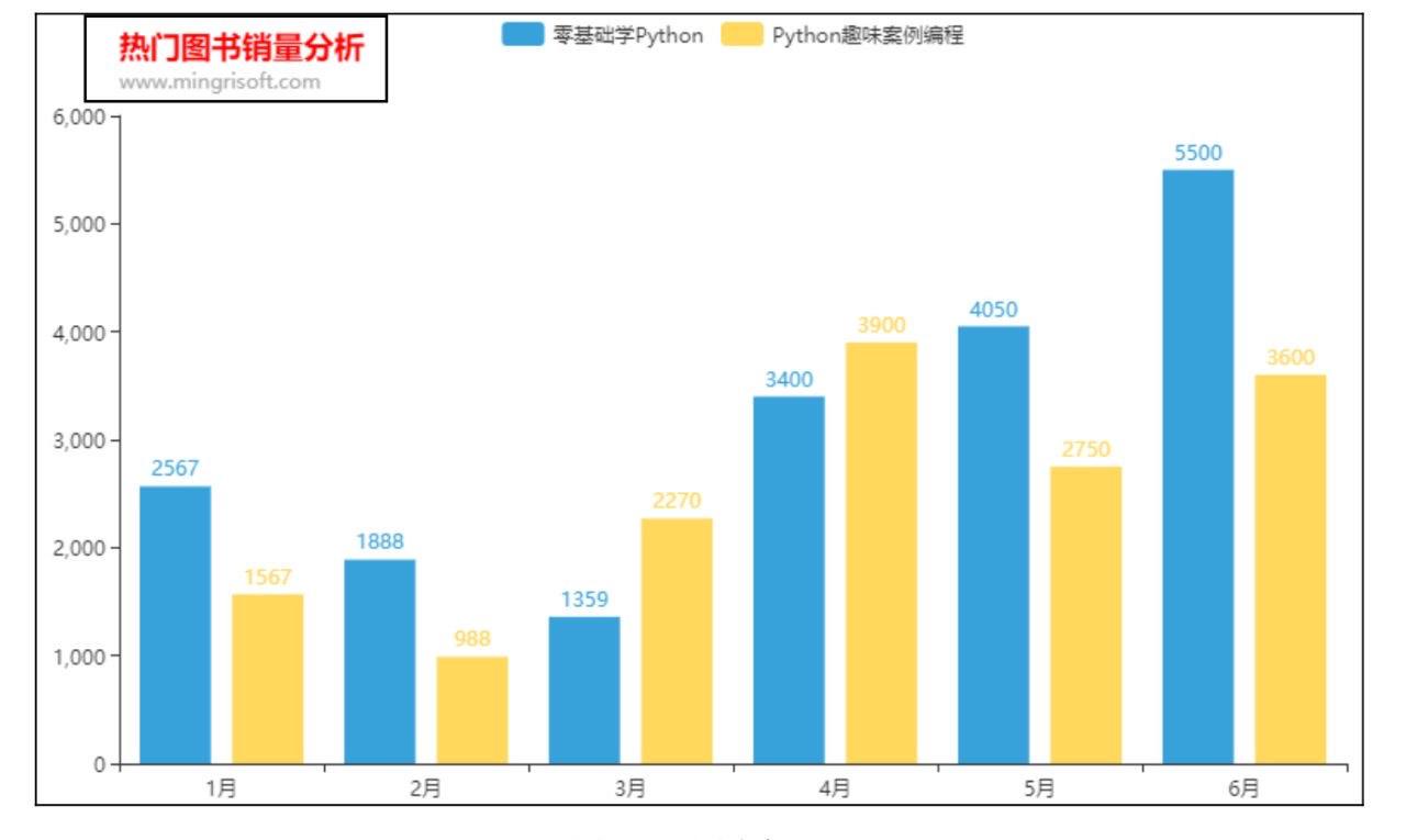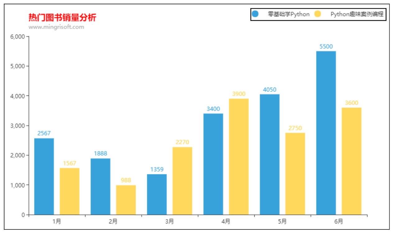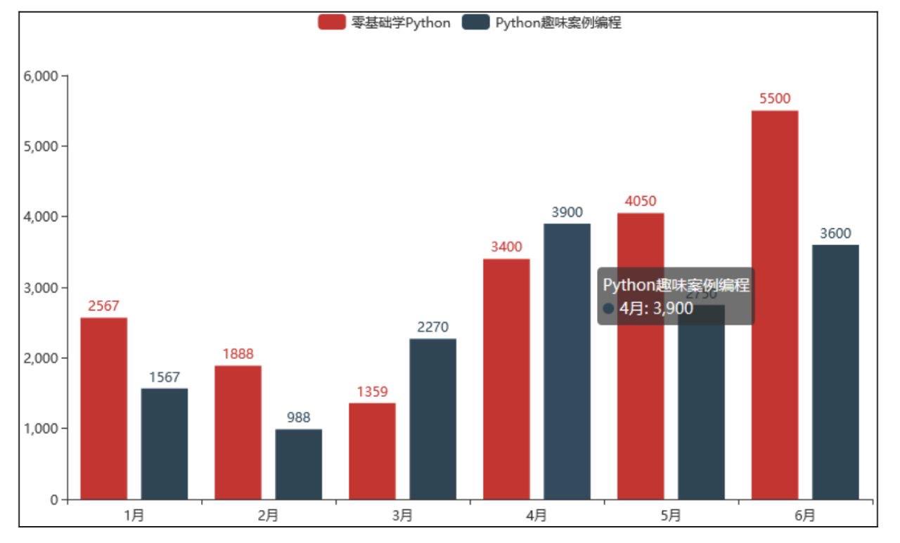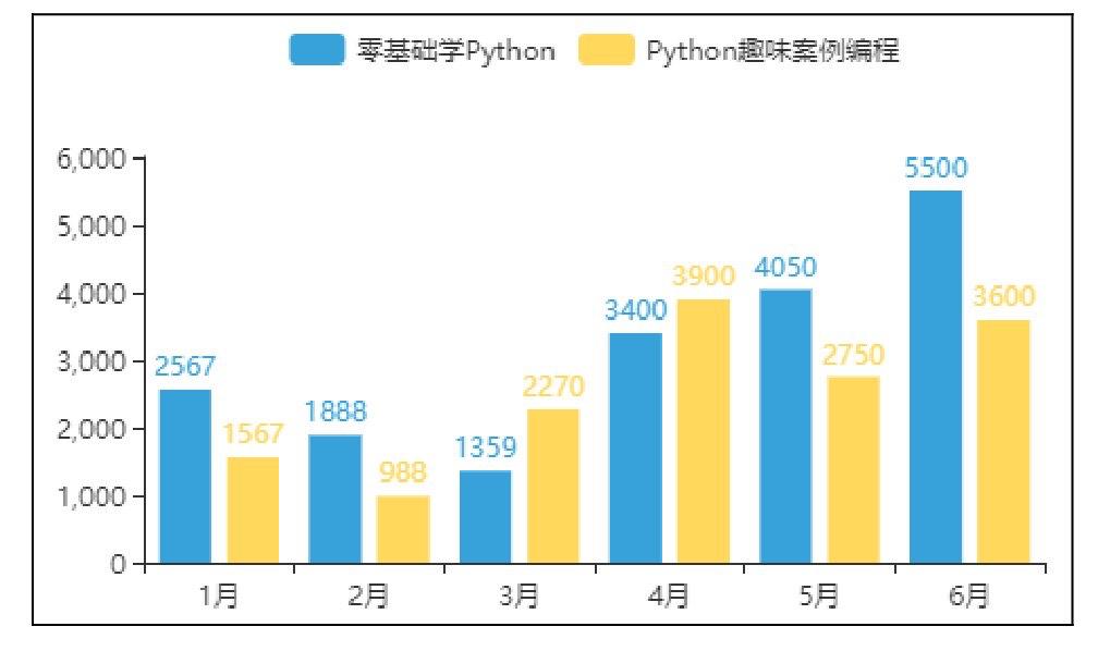 02 bar.add_yaxis("零基础学Python", [2567, 1888, 1359, 3400, 4050, 5500])