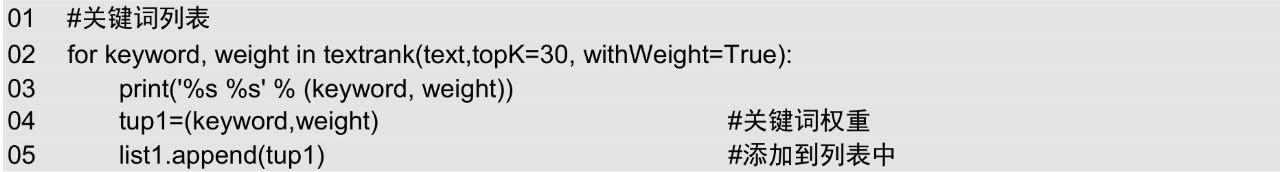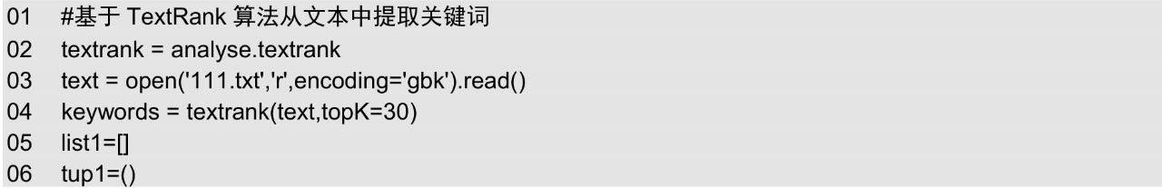 (3)使用TextRank算法从文本中提取关键词,代码如下: