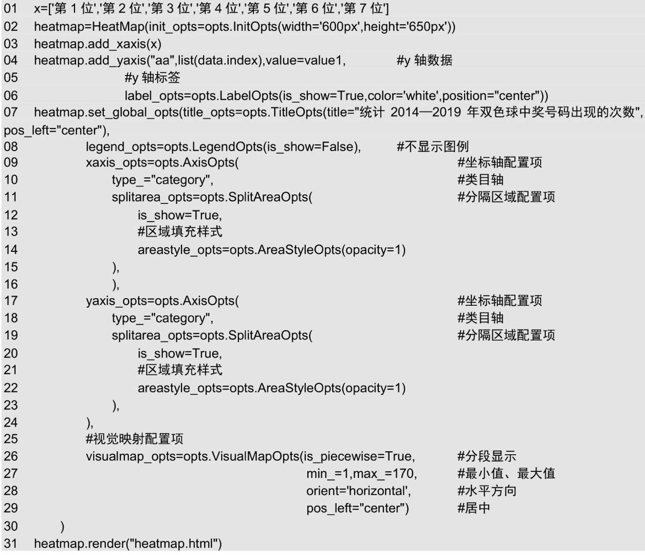 绘制热力图主要使用HeatMap模块的add_xaxis()方法和add_yaxis()方法。下面通过热力图统计2014—2019年双色球中奖号码出现的次数,具体步骤如下所示。