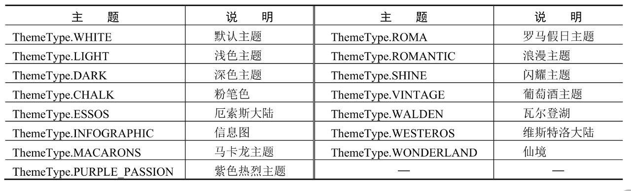 下面详细介绍一下ThemeType模块提供的15种图表主题风格,如表1所示。
