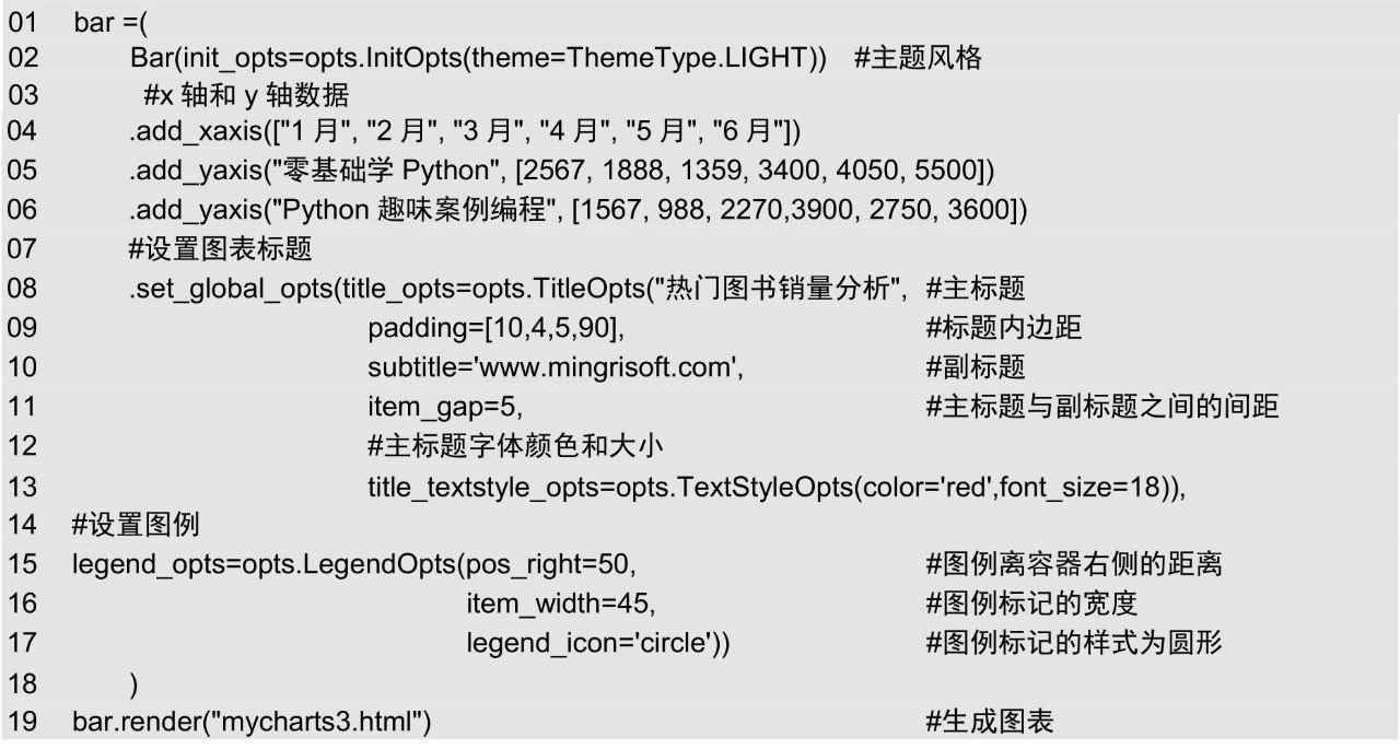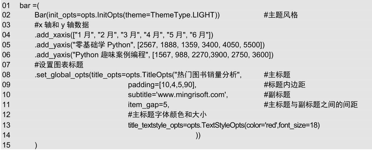 (4)生成图表,设置图表标题,包括主标题、主标题字体颜色和大小、副标题、标题内边距,以及主标题与副标题之间的间距。代码如下: