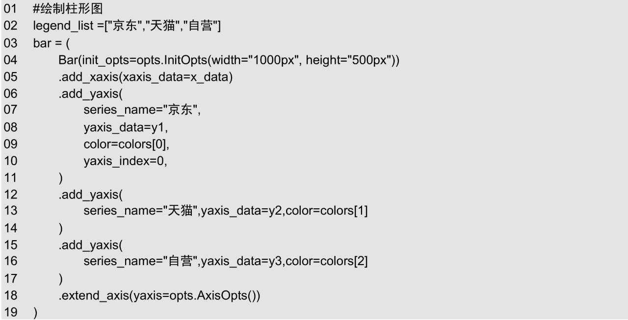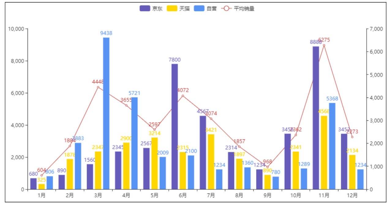 双y轴顾名思义就是两个y轴,下面实现柱形图+折线图双y轴图表的绘制,其中柱形图y轴表示月销量,折线图y轴表示3个平台的月平均销量,效果如图26所示。