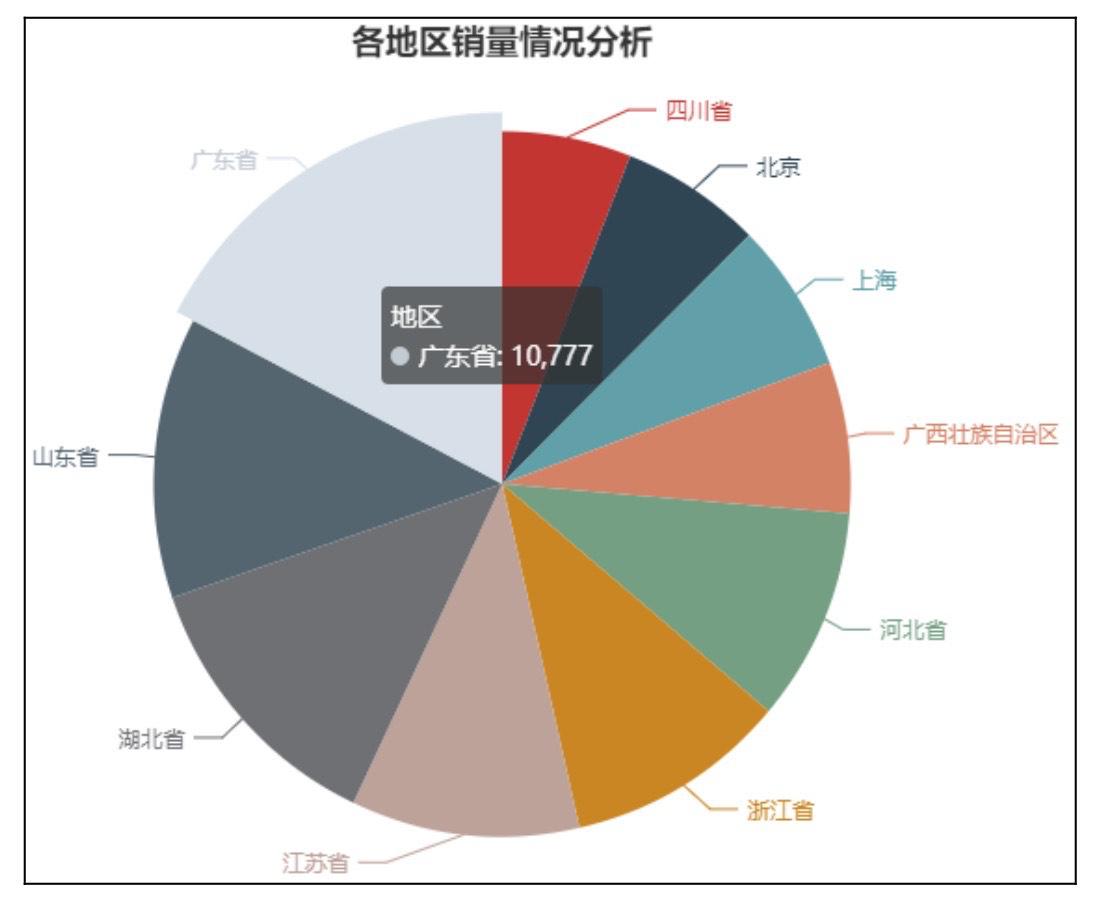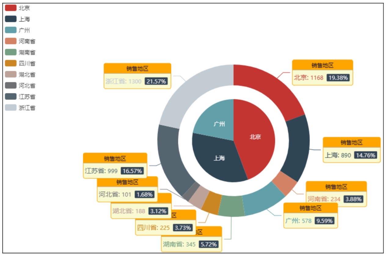 饼形图与环形图组合,其中饼形图展示“北上广”三大主要城市的销量情况,环形图展示其他省份的销量情况,效果如图27所示。