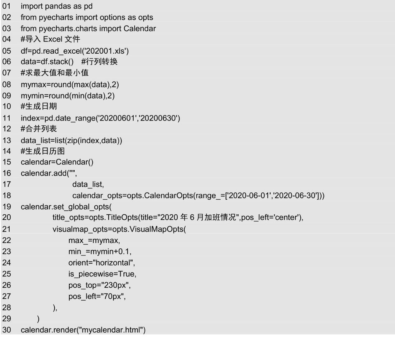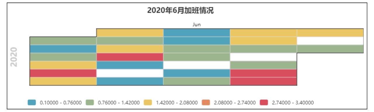 绘制日历图主要使用Calendar模块的add()方法实现。下面绘制一个简单日历图,通过该日历图分析6月份加班情况,程序代码如下: