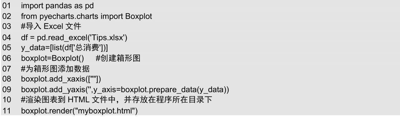 绘制箱形图主要使用Boxplot模块的add_xaxis()方法和add_yaxis()方法实现。下面绘制一个简单的箱形图,程序代码如下: