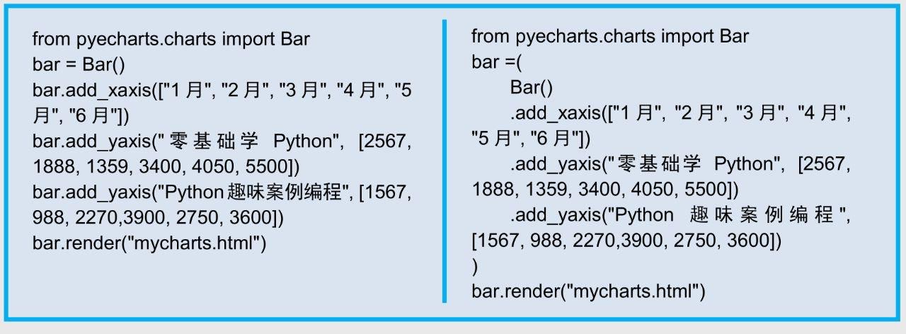 下面以本节的“第一张图表”为例,在调用Bar模块的各个方法时,将单独调用与链式调用进行简单对比,效果如图5所示。