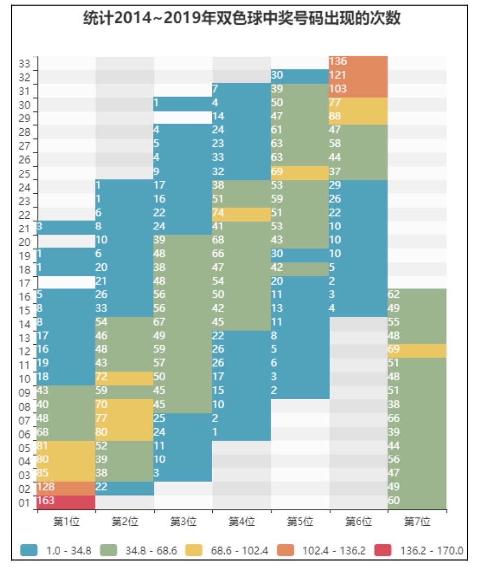 【示例16】 热力图统计双色球中奖号码出现的次数。(示例位置:资源包16)