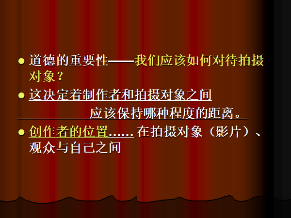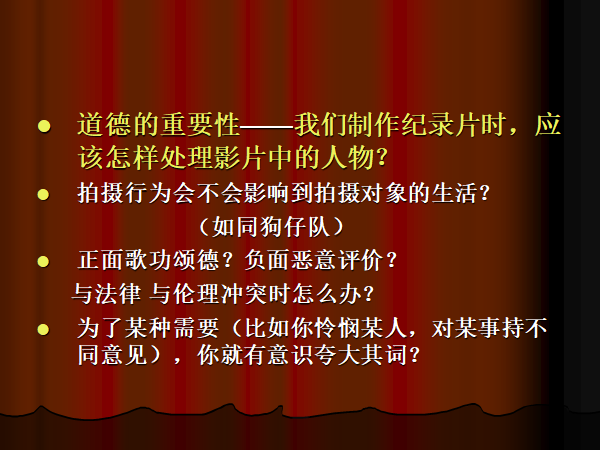 道德的重要性——比如,我们制作纪录片时,应该怎样处理影片中的人物?应该如何对待拍摄对象?对事件又是如何处理?