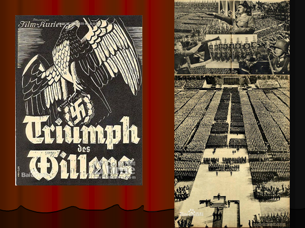 1935《意志的胜利》精湛地融合了电影的基本元素: 运动、节奏、光线、阴影、声音和静默——这部影片最突出的地方就是它撼人心魄的视觉结构。各种不同风格的视觉元素被强而有力地统辖在一种整体视野中。