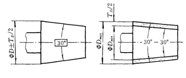 圆锥角公差可单向或双向表示,为保证内、外圆锥均匀接触,圆锥角公差多采用双向对称表示。AT1~AT5用于高精度角度样板;AT6~AT8用于传递大力矩的摩擦椎体、推销、工具圆锥等;AT8~AT10用于中等精度椎体零件;AT11~AT12用于低精度椎体零件。