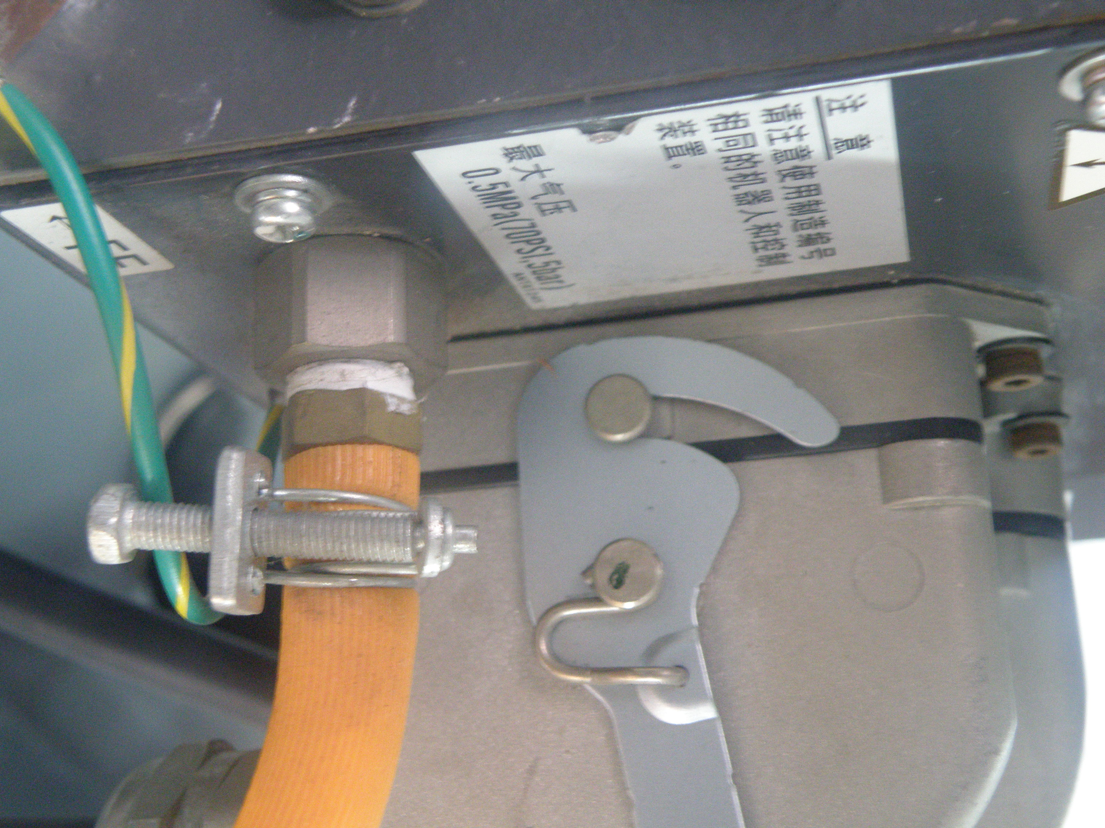 供气系统管路大致分为三段。其一,机器人本体供气管路,出厂之前已由生产厂商安装调试完毕。其二,气瓶与气阀开关,这部分由气体灌装企业安装、检验。其三,减压器、流量计总成,这是用户自备仪表。安装供气系统就是将这三部分连接起来,并检查气密性。减压器、流量计总成与气瓶之间用螺纹连接,连接前清理干净异物。减压器、流量计总成与机器人本体之间用供气软管连接,接头处用卡箍锁紧。