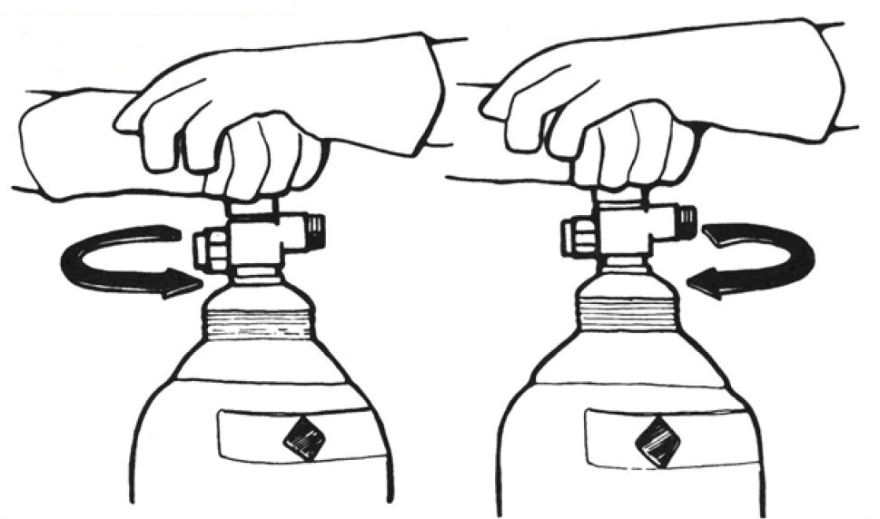 供气系统各组成部件工况良好,正确、可靠连接。每种气体只能使用规定的气瓶灌装,瓶中CO2气体不能用尽。气瓶必须直立使用,并确保其不会倒伏。气瓶不应置于高温、高热环境中,远离火花、火种及其它热源。气瓶不可通电,开启供气系统时,避免流出的气体伤害到人,尤其是头面和眼睛。正确开启和关闭气阀的操作如图,气阀手轮上标注有开启和关闭气阀的旋钮方向,气瓶在运输过程中应使用气阀保护帽。
