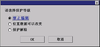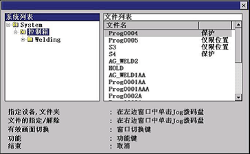 也可从程序属性界面上的[保护]框来改变该文件的保护等级(界面显示的是当前保护等级)。设置过保护的程序文件在文件名前面增加了符号,在【打开文件】后,窗口显示一列文件,如果程序文件前面有[×]符,则该文件禁止编辑。如果文件名前有[+]符,则该文件只可变更位置数据,如果文件名前是空白,则该文件没有保护。