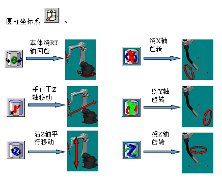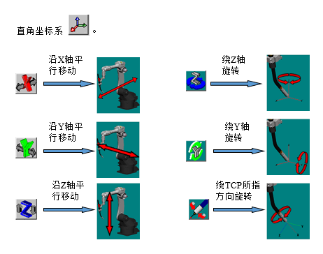 直角坐标系下,还可实现在保持TCP点位置不变的情况下,实现焊枪姿态的变化。如绕Z轴转动就是焊枪绕过TCP点的Z轴进行转动。操作方法与直线移动类似,按住绕Z轴旋转图标对应的功能键,拨动滚轮或按压±键可实现焊枪绕Z轴的转动。直角坐标系下,直线运动与转动的状态如图所示。
