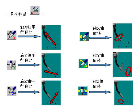 工具坐标系是把过机器人TCP点,沿焊丝送进的方向定为X轴的正方向建立的直角坐标系。工具坐标系下的移动、转动以TCP点和焊丝送进的方向密切相关。不同位姿条件下,机器人的运动有较大差异。工具坐标系下的操作方法与关节坐标系、直角坐标系下类似,运动状态如图所示。