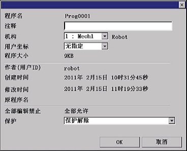 程序文件可设置为禁止编辑、只可变更位置数据、解除保护三级保护命令。设置为禁止编辑时,该程序文件不可编辑。只可变更位置数据表明该程序不能变更命令构成,只可以变更示教点的位置。