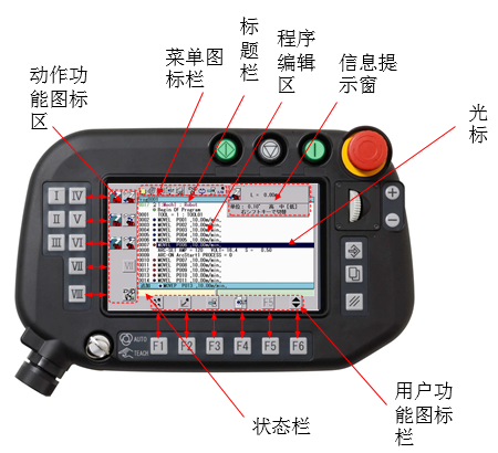 示教器屏幕显示可分为动作功能图标区、菜单图标区、标题栏、状态栏、用户功能图标栏及程序窗口、信息提示窗口等部分组成。