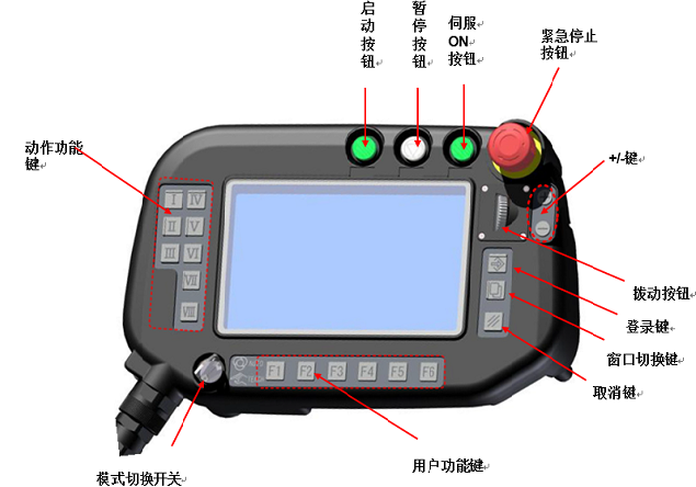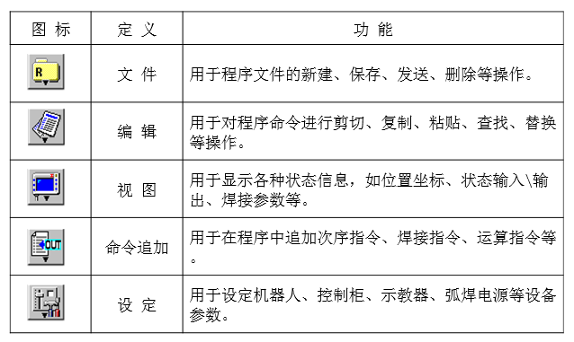 示教器显示屏不是触摸屏,不具备交互功能。动作功能图标区、用户功能图标区的图标功能需要按压相对应的动作功能键和用户功能键。菜单栏、程序窗口等的切换需要按【窗口切换功能键】才能实现。信息提示窗口提示当前运动信息,状态栏提示当前处于什么状态。例如,天蓝色提示当前处于追加状态,湖蓝色提示当前处于替换状态,粉红提示处于删除状态。