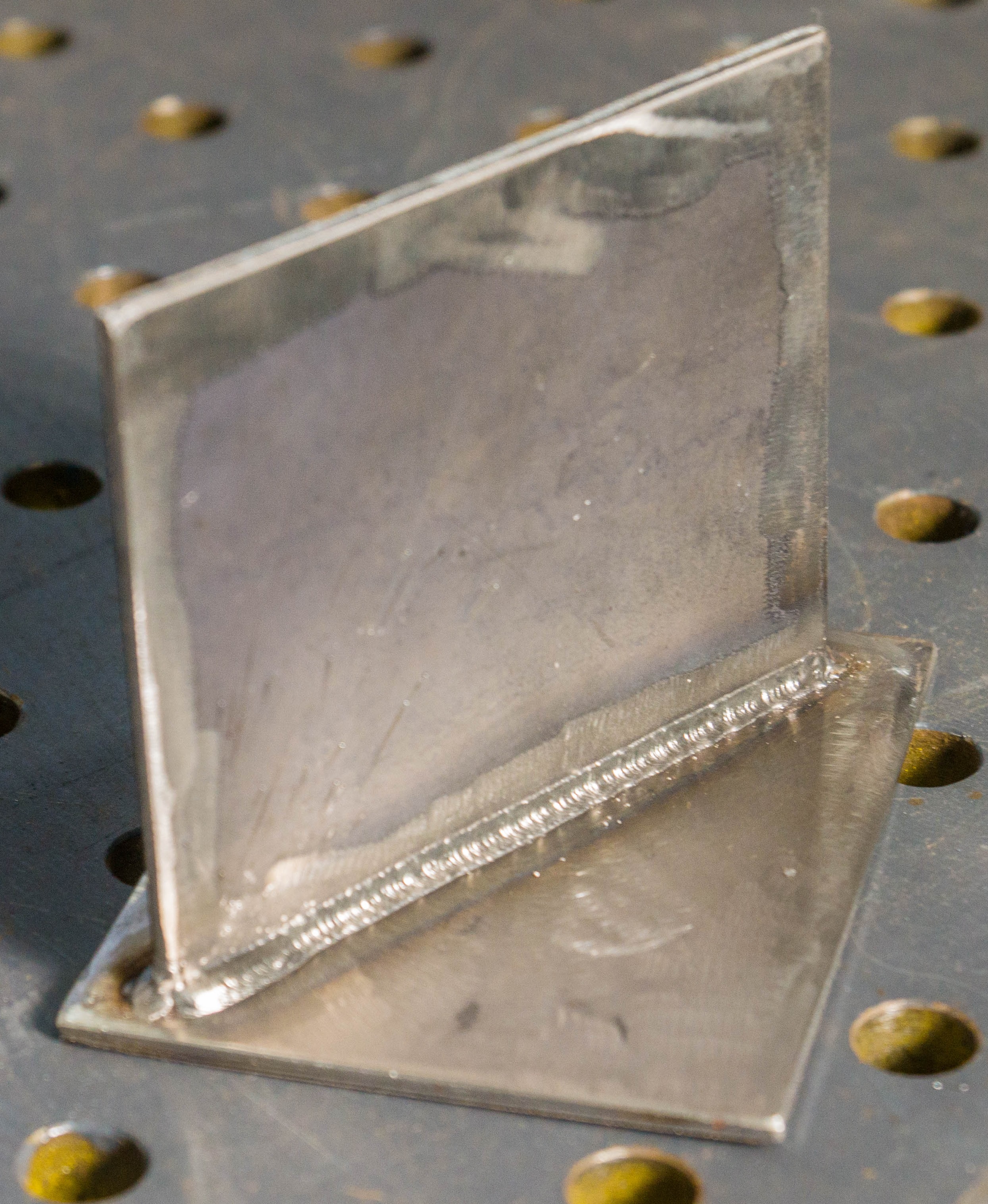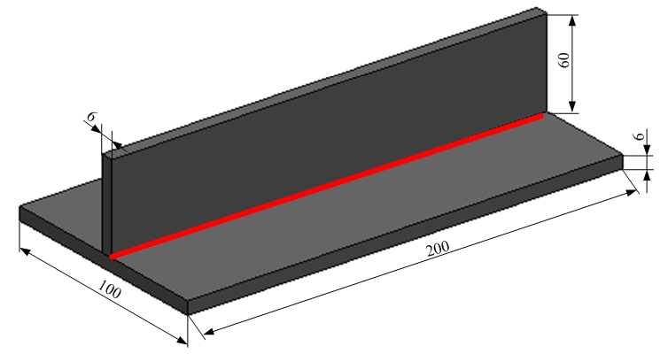 检查送丝系统,供气系统工况,在确认焊接电源的工作状态和机器人工作环境安全后,将模式切换开关打到运行(Auto)上即可运行在示教模式(Teach)下编辑好的程序,对试件进行焊接加工,完成薄板T形接头平角焊缝机器人自动焊接,完成后的试件如图。