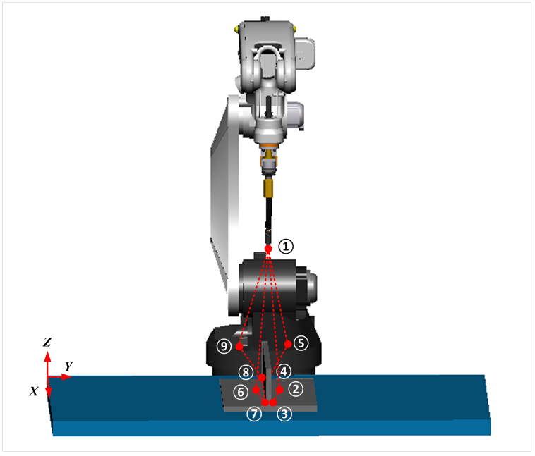 薄板T形接头平角焊为对称焊缝,共规划9个示教点,示教点排列顺序如图。点①为原点,程序开始和结束时都需要记录,第一道焊缝结束后机器人回到原点,然后再焊接另一道焊缝。点②为焊接作业临近点,插补方式为MOVEP,属性设为空走。点③为焊接起点,插补方式为MOVEL,属性设为焊接。点④为第一道焊缝焊接结束点,插补方式为MOVEL,属性设为空走。点⑤为退枪避让点,插补方式宜设为MOVEL,退枪避让最好走确定的直线轨迹,属性设为空走。焊接完成后让机器人回到原点,原点可以复制粘贴,设定为空走。点⑥~点⑨跟前一道焊缝点②~点⑤的设置相同。