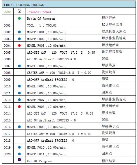 (7)回到点①,即机器人原点。操作方法一:A.关闭机器人运行功能,进入程序编辑状态。B.将光标移至点①所在的行,点击复制功能键,复制该行。C.将光标移至程序末行,选择向下粘贴。操作方法二:A.关闭机器人运行功能,进入程序编辑状态。B.将光标移至程序首行。C.手动跟踪至点①。D.登录该点。注意:方法二是在确定焊枪在退枪避让状态下,在跟踪回原点的过程中无障碍的前提下才可使用。