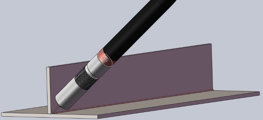T形接头平角焊缝的机器人焊接与薄板对接平焊类似,是水平位置的直线焊缝,焊枪插补方式为MOVEL,该焊缝不需要摆动。编程和焊接时注意焊枪规避工件和夹具,焊枪倾角和转角也与对接平焊有较大差异。为了保证根部焊透,应适当加大焊接电流。