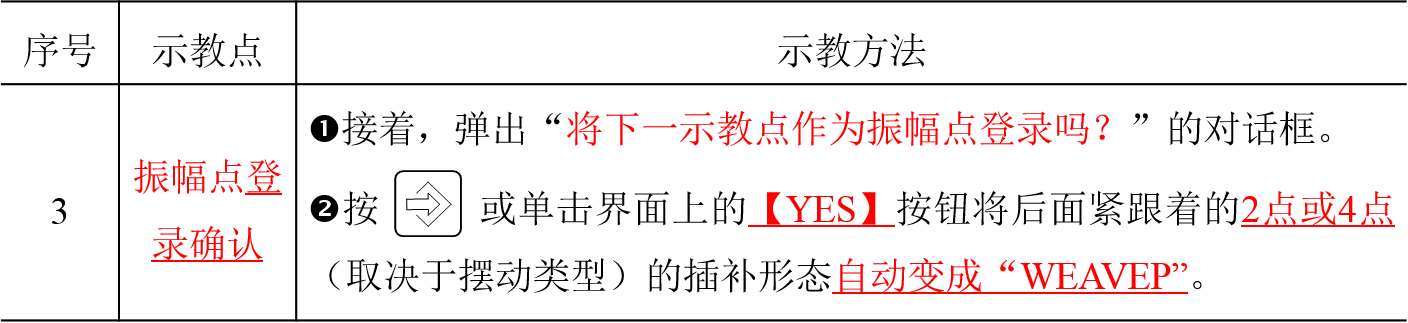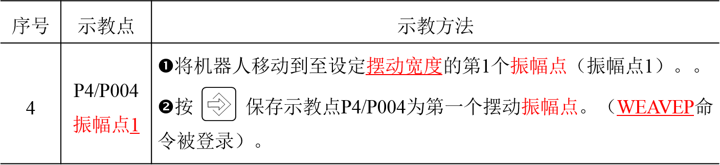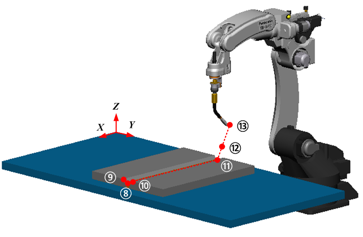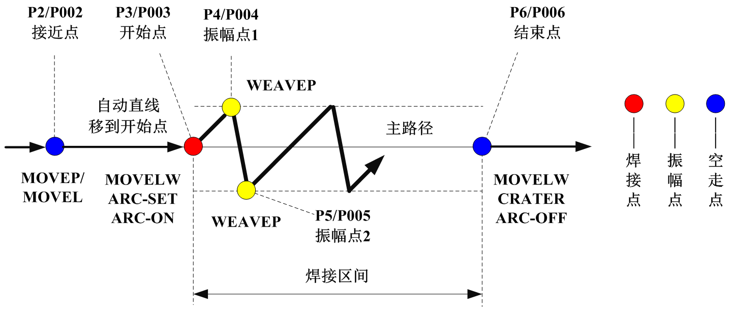 与打底焊类似,盖面焊也需要进行直线摆动焊。将点⑧和⑪的插补方式由直线插补MOVEL改为直线摆动插补MOVELW,设置点⑨和点⑩为摆动振幅点WAVEP。机器人完成直线焊缝的摆动焊接需示教4个以上特征点,插补方式选“MOVELW”,振幅点设置用“WEAVEP”指令。直线摆动插补时焊枪运行轨迹如下图。