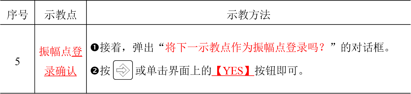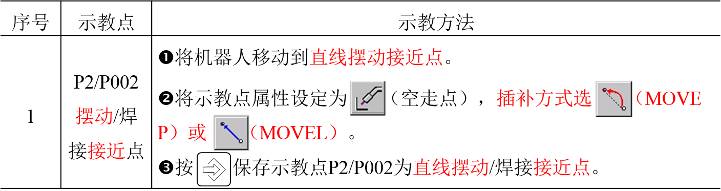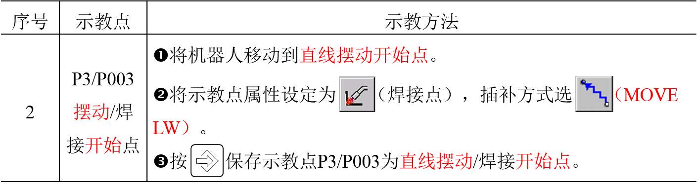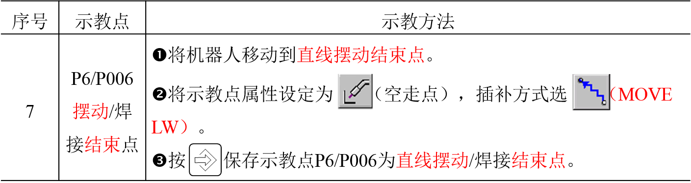 打底层是一直线焊缝,焊接填充量较大,需要在与焊缝垂直的方向上增加焊枪横向摆动。与单纯直线焊缝相比,中厚板打底焊示教编程需要增加两个摆动振幅点,如图中的点④和点⑤。将点③和点⑥的插补方式由直线焊缝的MOVEL,改为直线摆动焊接的MOVELW,将点④和点⑤的插补方式设置为WAVEP,其它示教点与直线焊缝相同,参见任务薄板对接平焊缝示教编程。