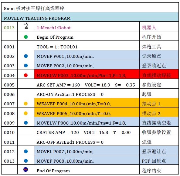 中厚板对接平焊缝打底焊示教编程完成后生成的程序见下表。打底焊完成后可继续进行盖面焊编程。在获得打底焊经验数据后,可调用打底焊程序并修改部分示教点的位置、属性。