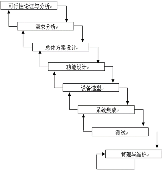 物联网工程系统(物联网应用系统)开发阶段可分可行性论证与分析、需求分析、总体方案设计、系统功能设计、设备选型、系统集成、单元测试、管理与维护。