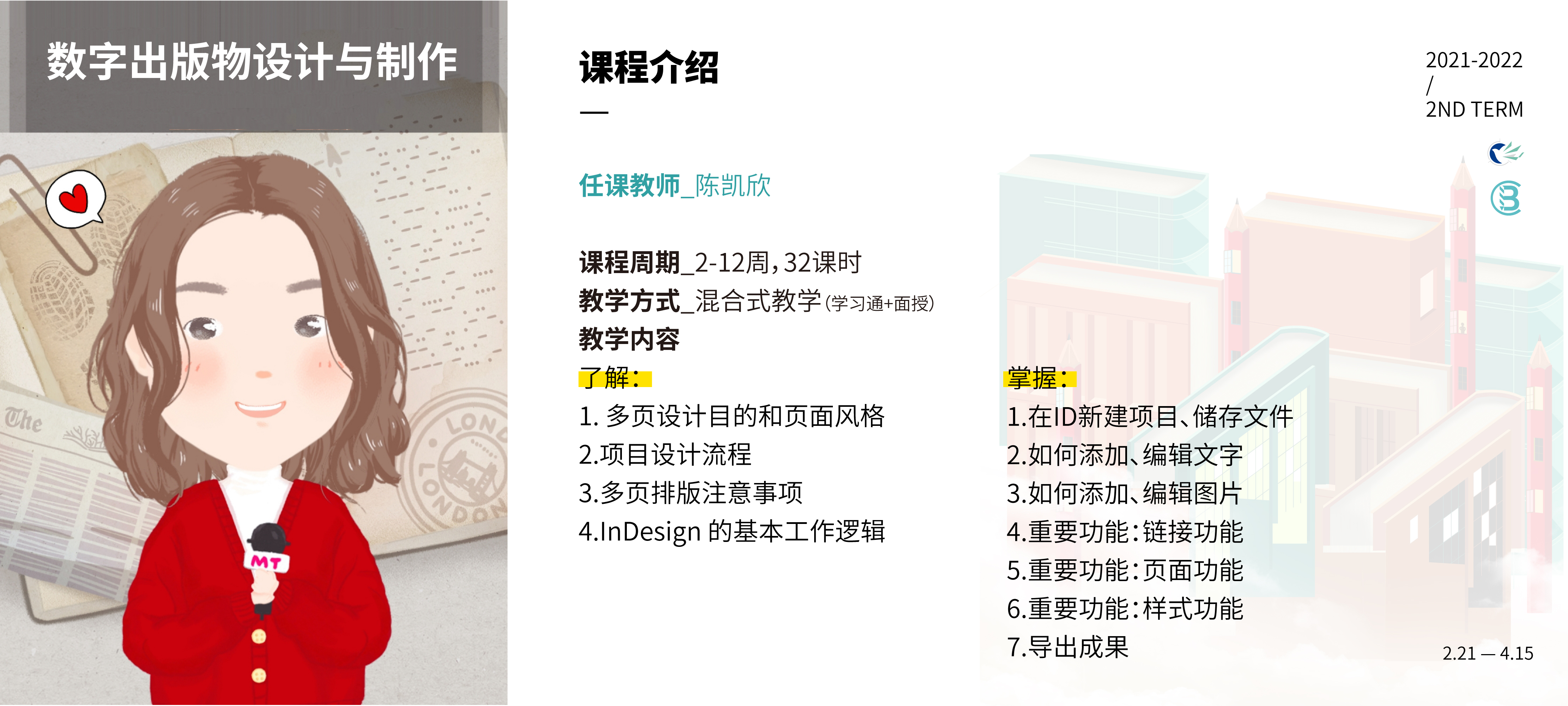 同学们好!本学期我们的《数字出版物设计与制作》课,将于进行线上、线下混合教学!课后,我将把教学课件、indesign技巧视频发到课程章节,便于大家每周复习和学新知识。