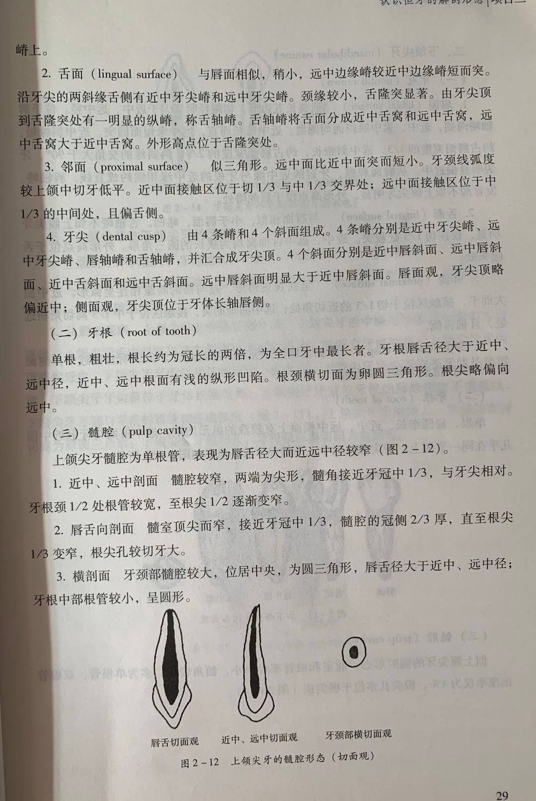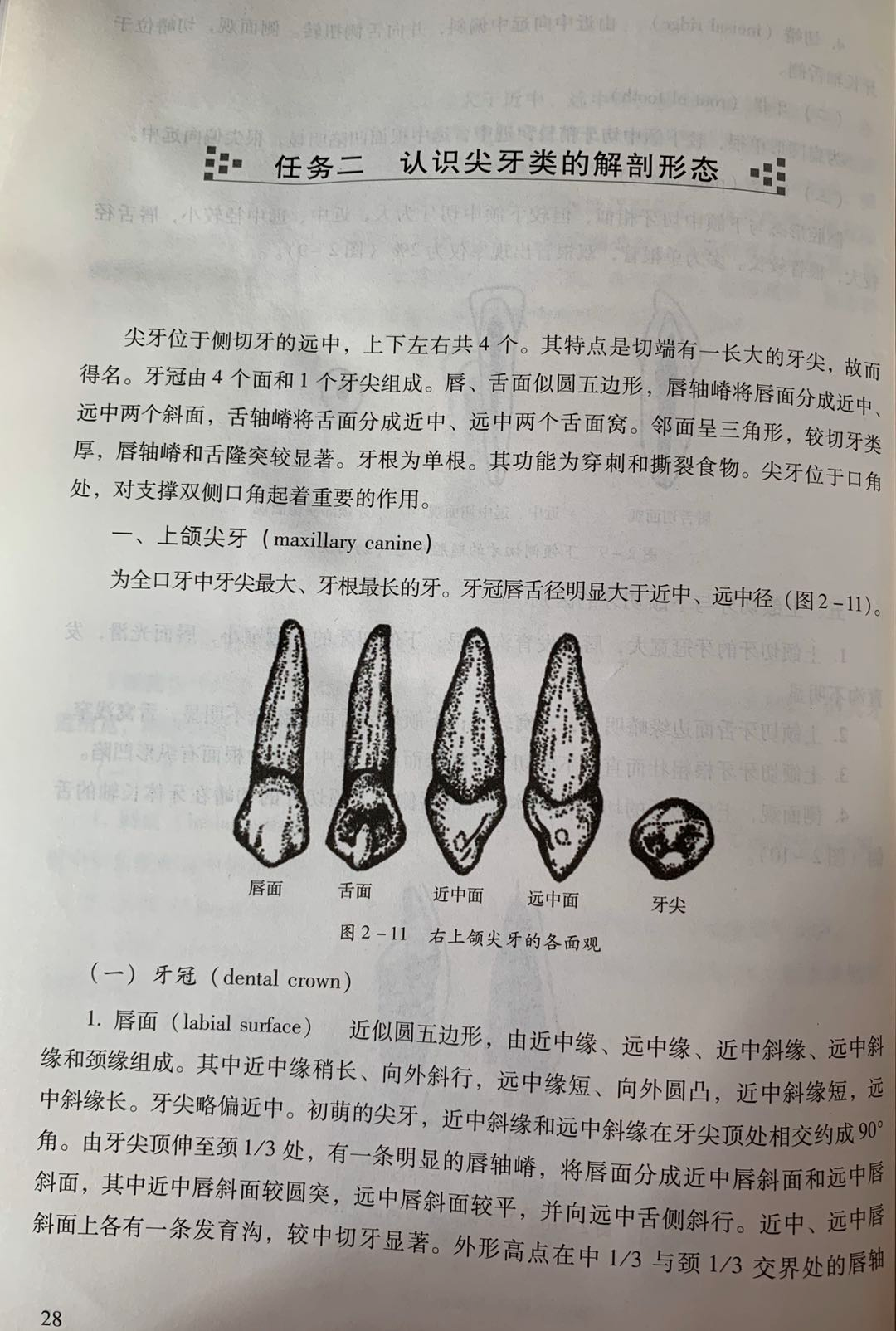 上颌尖牙牙冠较厚,尖长大,主要功能是穿刺撕裂食物。唇侧观:呈五边形,唇轴嵴显突,并将唇面分为近、远中斜面,牙尖偏向近中,远中缘较短突,外形高点在中1/3与颈1/3交界处。舌侧观:近中边缘嵴较长,近中牙尖嵴较短,从牙尖至舌隆突有一线形的隆起叫舌隆突,将舌窝分成较大的远中舌窝和较小的近中舌窝。邻面似三角形较切牙的邻面突。近中接触区距近中牙尖嵴近,远中反之且偏舌侧。