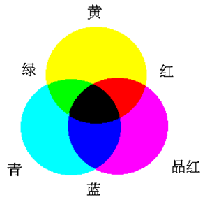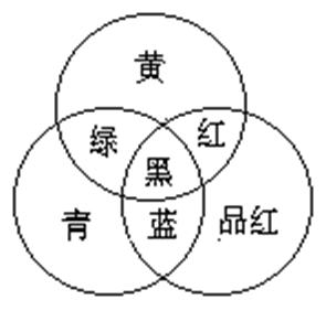 图3-2 RGB三基色叠加效果 (2)CMYK 颜色模型。CMYK 模型以打印在纸上的油墨的光线吸收特性为基础。当白光照射到半透明油墨上时,色谱中的一部分被吸收,而另一部分被反射回眼睛。哪些光波反射到眼睛中,决定了人们能感知的颜色。CMYK模型中也定义了颜料的三种基本颜色——青色(Cyan)、品红(Magenta)和黄色(Yellow)。在理论上说,任何一种颜色都可以用这三种基本颜料按一定比例混合得到。由于所有打印油墨都包含一些杂质,因此这三种油墨实际生成土灰色,必须与黑色(K) 油墨合成才能生成真正的黑色(为避免与蓝色混淆,黑色用K而非B表示),所以CMY又写成CMYK。