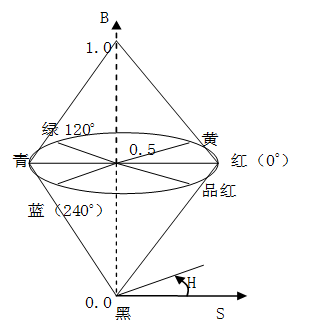 HSB 模型建立在人类对颜色的感觉基础之上。H表示色调(也称色相)、S表示饱和度、 B表示亮度。–色调反映颜色的种类,如红色、橙色或绿色,是人们眼看一种或多种波长的光时产生的彩色感觉。–饱和度是指颜色的深浅程度或纯度,即各种颜色混入白色的程度。要减少颜色的饱和度可在该颜色中添加白色。对同一色调的光,饱和度越高则颜色越鲜艳或者说越纯。色调和饱和度通常统称为色度。–亮度是颜色的相对明暗程度。HSB颜色模型可用图3-4表示。