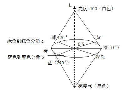 Lab 颜色由亮度或光亮度分量 (L) 和两个色度分量组成:a分量保存从绿色到红色所对应的色彩信息;b分量保存从蓝色到黄色所对应的色彩信息,如图3-7所示。单个a或b无意义,只有a,b结合才有意义。