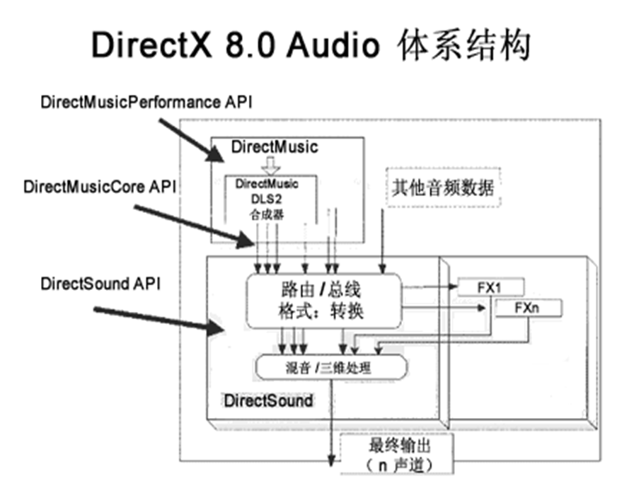 声音部分中最主要的API是DirectSound,除了播放声音和处理混音之外,还加强了3d音效,并提供了录音功能。DirectX 8.0 以后的声音部分的新特性包括: