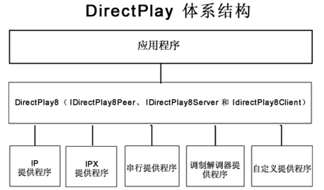 DirectPlay 是应用程序和通讯服务之间的高级软件接口。有了DirectPlay,通过Internet、调制解调器链接或网络来连接游戏将非常简单。